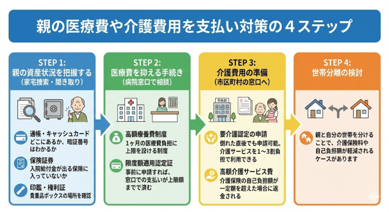 親の医療費や介護費用を支払い対策の4ステップ