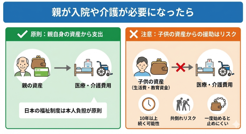 - 子供が自分の生活費や教育資金を削って援助を始めると、共倒れになるリスクがある